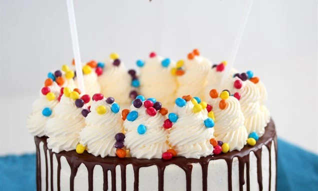 Smelt sjokolade, fyll den i et kremmerhus eller pose og skriv tekst på kaken. Dekorer med roser og gylner perler.