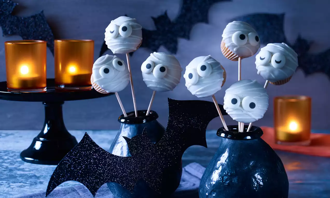 Pisk eggehviter og sitronsaft med en håndmikser og pisk så inn melis. Overtrekk de avkjølte cupcakes med glasuren. Ha resten av glasuren i en sprøytepose eller frysepose. Klipp av et lite hjørne og tegn på linjer av glasur. Fest sukkerøynene raskt på glasuren før den stivner.